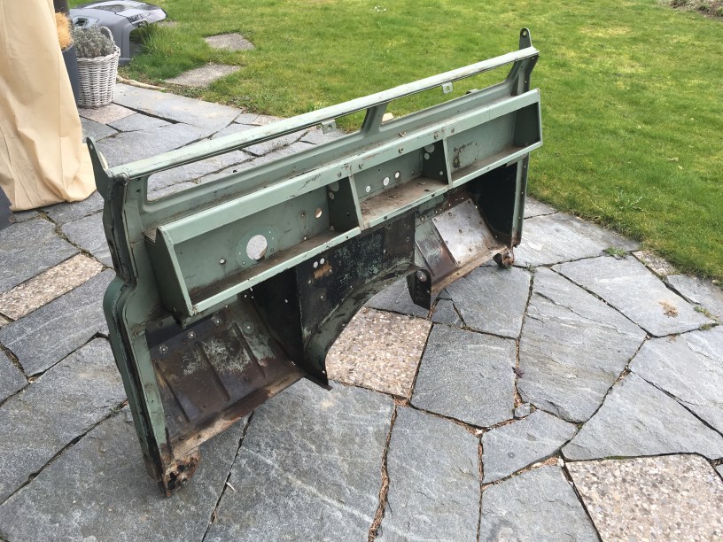 Below: Bulkhead fully stripped and attending a photo shoot in the garden. Nice patch panel on the near side footwell but overall for a vehicle of this age, it’s in remarkably good condition. I have seen modern Land Rover bulkheads in the UK with far worse corrosion. I put it down to the fact that almost ever single car here in Switzerland is garaged overnight or at least under cover, having a chance to dry out. Plus the roads are not pummelled with salt all winter quite as much as in the UK. The bulkhead is now in storage in the bike shed awaiting for me to build a crate and send it to the UK