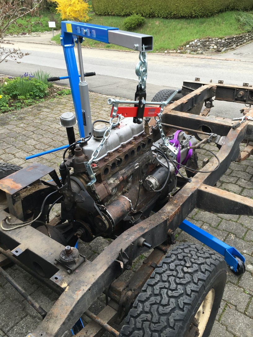With the roof, side panels, windscreen frame, doors, bulkhead, wings, radiator panel, rear tub, brake lines and seat box removed, the next step is removing the engine and gearbox.