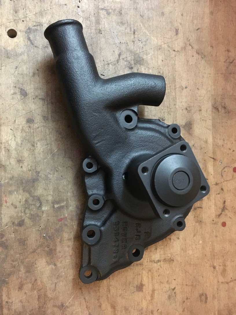 Primary pinion bearing (to be removed) resides behind the large castleated nut. This nut is on a left hand thread….The official method of supporting the shaft whilst the nut it removed is shown thus. Take the old clutch plate, stick it in a vice and insert the shaft… and with a “tap” with a pin punch on one of the flats, the nut spins loose…. I was amazed that this was exactly what happened. Not the spiral on the shaft…. This exists to feed oil into the clutch release bearingNow onto the small parts removed from the engine…. this is the water pump. Bearing and seal are new, so a good clean up and a couple of coats of high temperature paint is all that is requiredThats a bit more presentable.