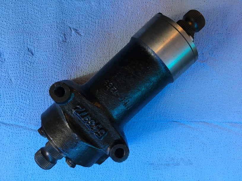 Relay slots into this hole in the first cross member. A generous coat of copped slip was applied to the body of the relay first…Relay installedOriginal relay plate (circular thing with 4 bolts) prevents the bottom end moving when steering and causing (more) vagueness in the steering. The early models were much thick and provided more resistance. The lower steering arm is also fitted.The relay must be filled with EP90. 2 of the 4 bolts are removed. One to let the oil in, and one to let the expelled air out.Reconditioned upper and lower steering arms ready for fitmentThe track rod (long bar running between the wheels) has been in place since the front axle build and the vacant apertures on the drop arms will house the drag link.Drag link offered up but not yet bolted in place. The bracket on the arm is for the steering damper.Swivel joints torqued up to the correct settingOld Man Emu steering shock bolted upFront end complete