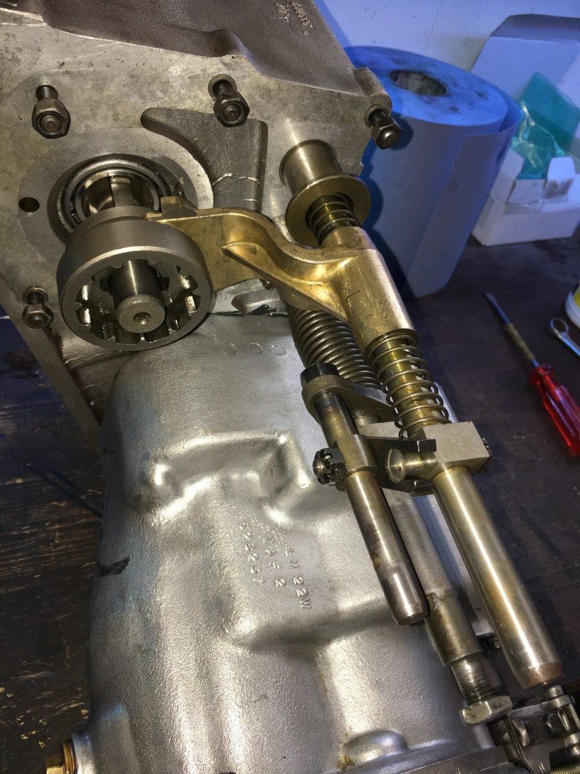 The final stage of the gearbox rebuild is inserting the selector shafts. These comprise of two rods which control engagement of 4WD high range and 4WD low range and are operated from the red and yellow levers in the cab.