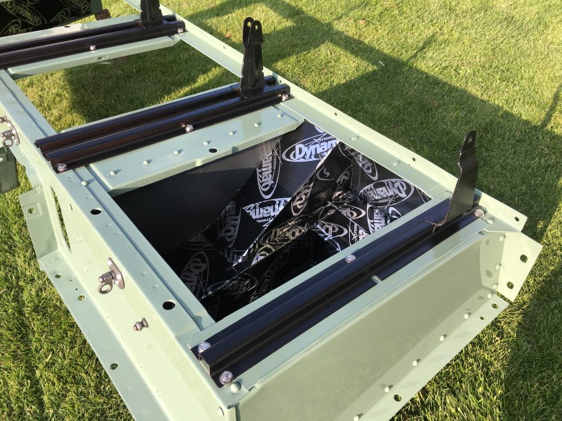 Seat box, extension pieces and seat frames ready to be fittedDYNAMAT left overs…We’ll start with the inside of the battery box with the offcutsI’ll line the inside with carpet before the end of the project but i ran out of time todayAnd the underside of the seatbox4 seat rails ready to fitThe two extension panelsRight hand extension panel offered up1 of 4 of the seat rails fitted with new stainless steel fixings. I won’t bore you with photos of 2,3 and 4 as they are much the sameI found the 1st extension panel rattled a little against the seat box so I removed the seat rail and panel and filled the gap with some amalgamating tape. Rattle cured. If only all Land Rover rattles were so easily so easy to cure… In the UK you would just drive through a pot hole… Bang.. rattle fixed 🙂Both of the swivel clips were also re-installed (in their original locations) with the aid of the new air hammer. I took a chance…. an air hammer is quite noisy and making a noise on a Sunday in Switzerland isn’t really the done thing. I figured, it’s only 6 rivets and there was enough pressure in the tank, so I don’t need to run the compressor… also noisy.And there’s the finished product. I’ll prep and paint the 3 covers this week.