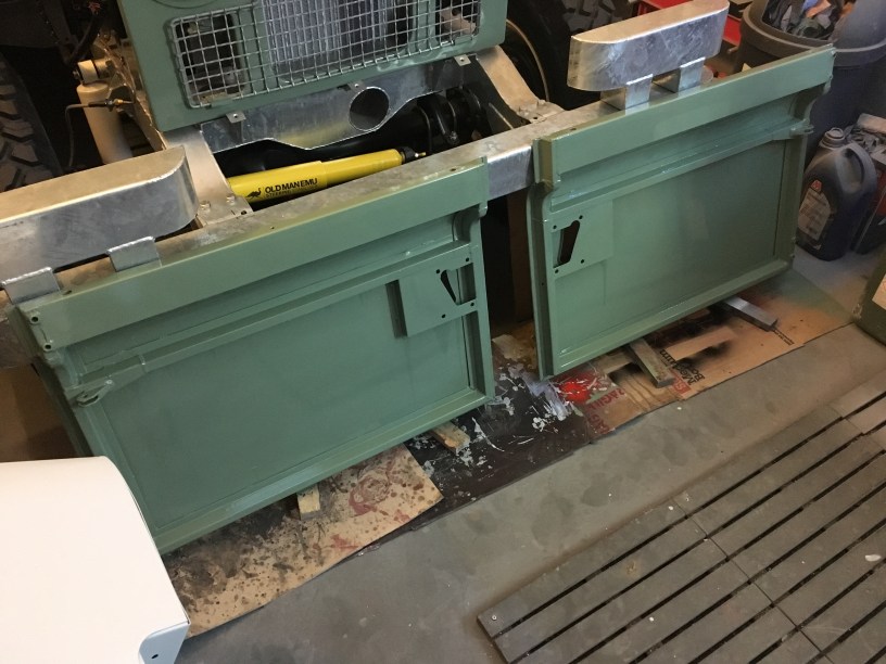 I had a small amount of pastel green paint left over, so whilst I wait for a fresh supply to arrive, I brush painted the inside skin of the new doors. As it was almost snowing outside I couldn’t put LGL on the driveway so there was no chance to use the spray gun.