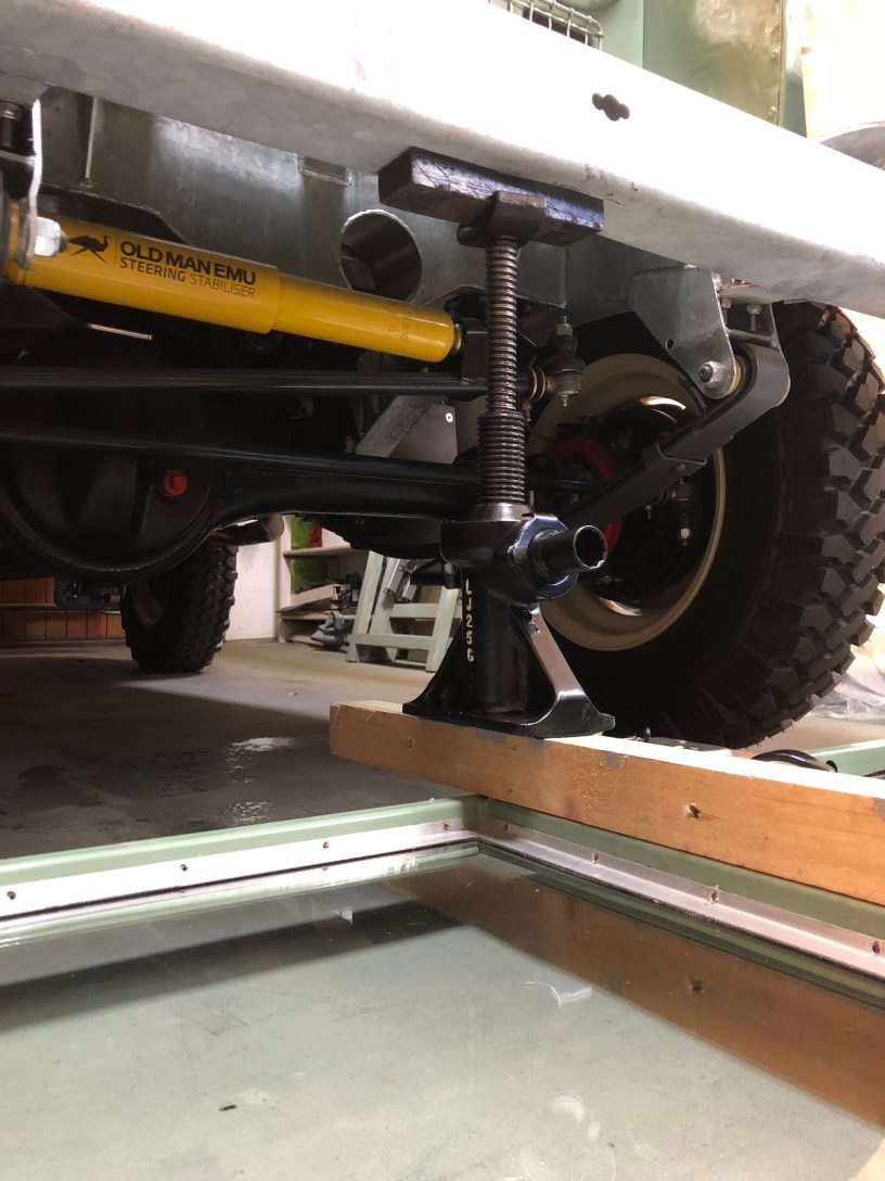Most of the body was removed, some wooden blocks and the back-actor of a JCB digger were used to “bend” the chassis… it worked.
