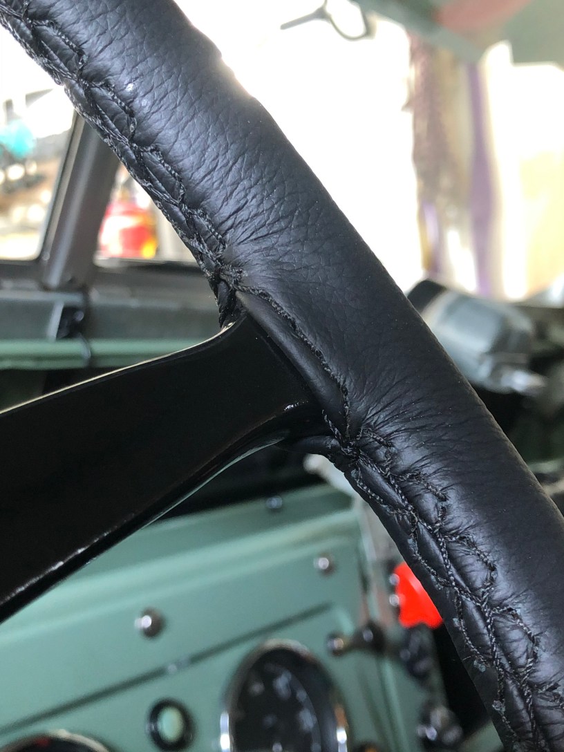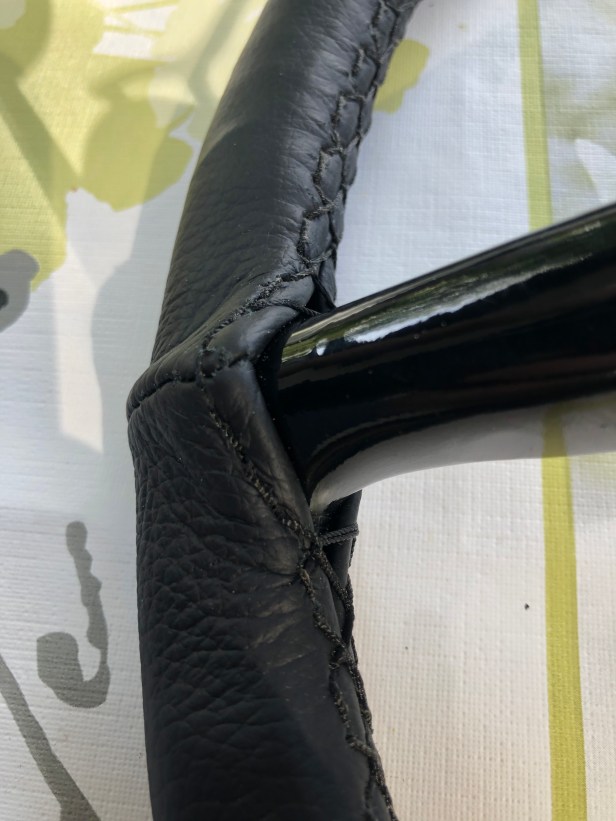 Stitched all the way around and refitted to the steering column. I drove the car today and it’s super comfy to hold.