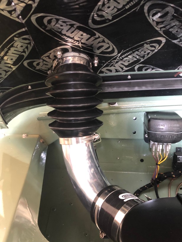 So that’s all of the plumbing on the outside of the vehicle.Next the 90 degree bend and bellows hose were fixed in place beneath the bonnet.This is the whole system, end to end. Centrifugal filter. Connector. Galvanised intake pipe. Flexible tubing. 90 degree bonnet spigot. Bellows hose. 90 degree bend. Connector. Oil bath air filter. Flexible pipe to the carb.